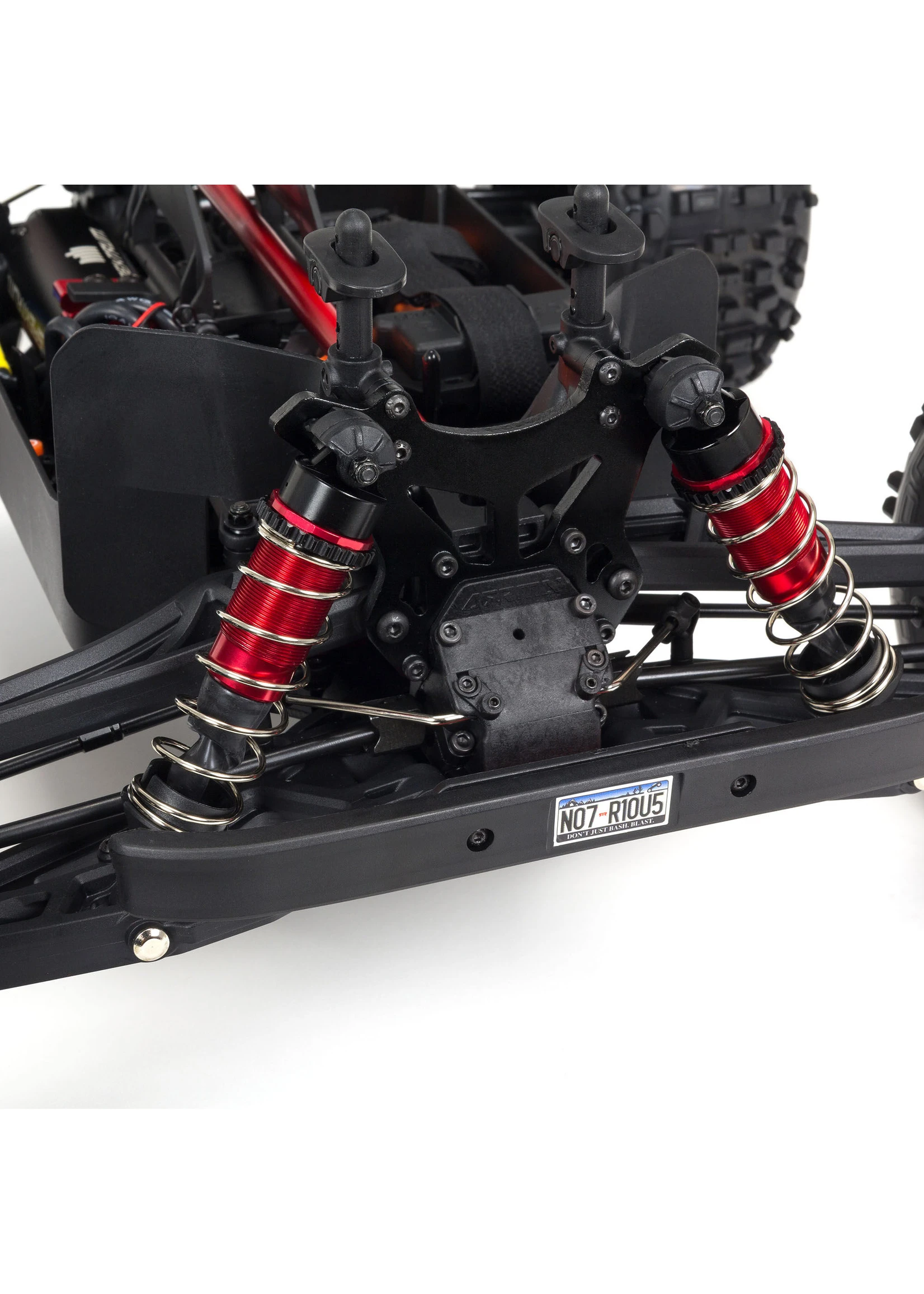 For the toughness needed to support extreme stunts, ARRMA® uses a strengthened anodized aluminum chassis as the foundation. A center body support and aluminum center brace plus composite chassis side pods add more durability. All-metal diff outdrives and gearbox internals plus durable steel driveshafts provide a reliable, heavy-duty drivetrain that holds up to extreme stunts and high-speed bashing. A “never loose” aluminum steering servo saver and “never pop” ball ends supply more precision, reliability and confidence.