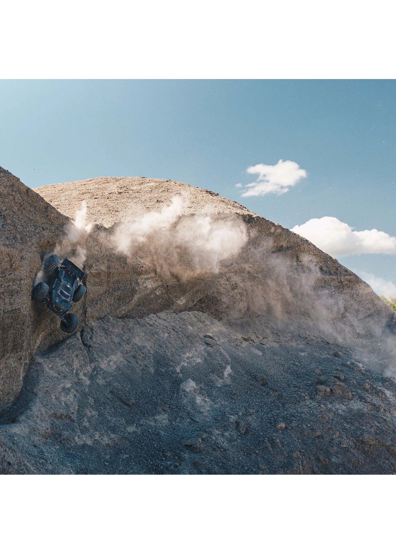 Rugged chassis components, including all-metal diff outdrives and gearbox internals, a heavy-duty drivetrain, strong composite chassis side pods, durable steel driveshafts, and more contribute to unstoppable bashing performance. The EXB front bumper and skid plate let you fearlessly tackle almost anything that stands in your way.
