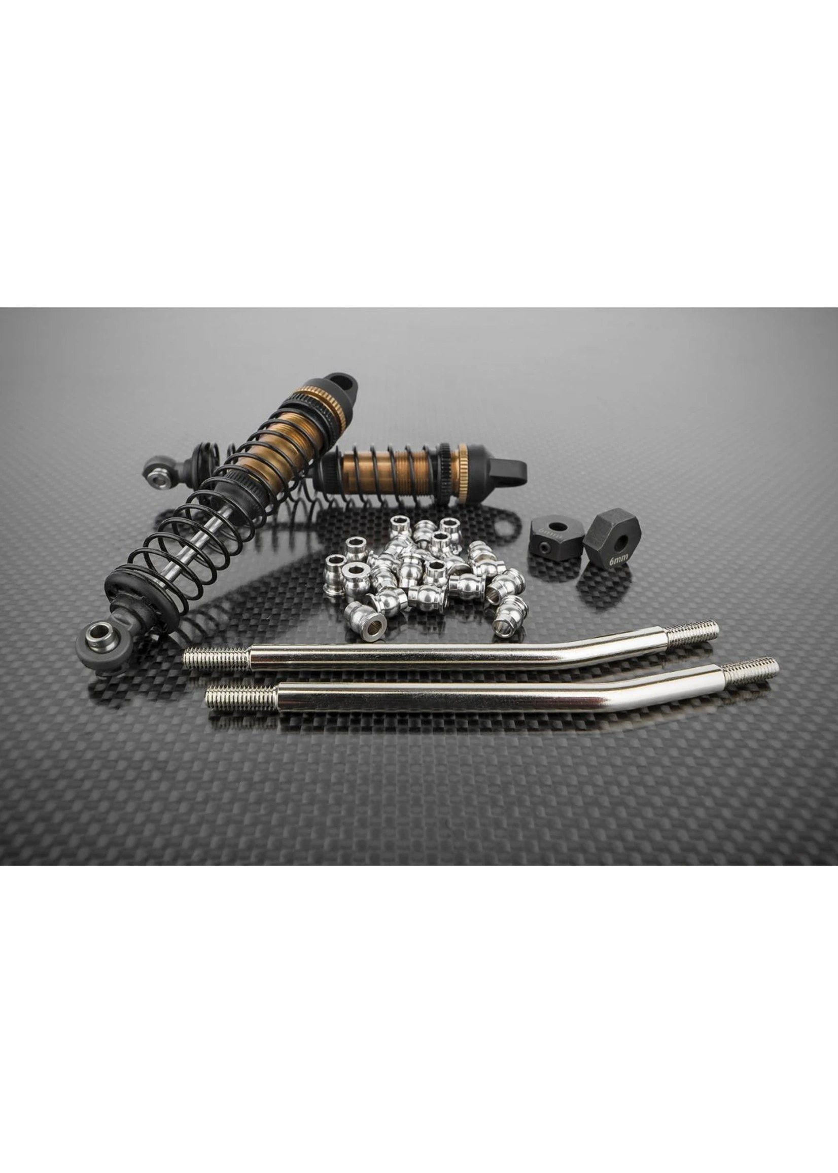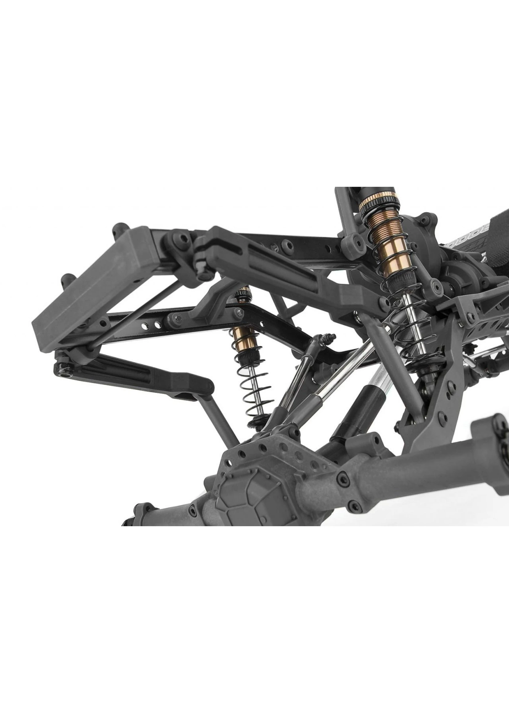 To increase performance we’ve included several Factory Team parts. Our bronze shocks (4), steel wheel hexes (4), machined metal pivot balls, (30), and lower high-clearance front links (2).