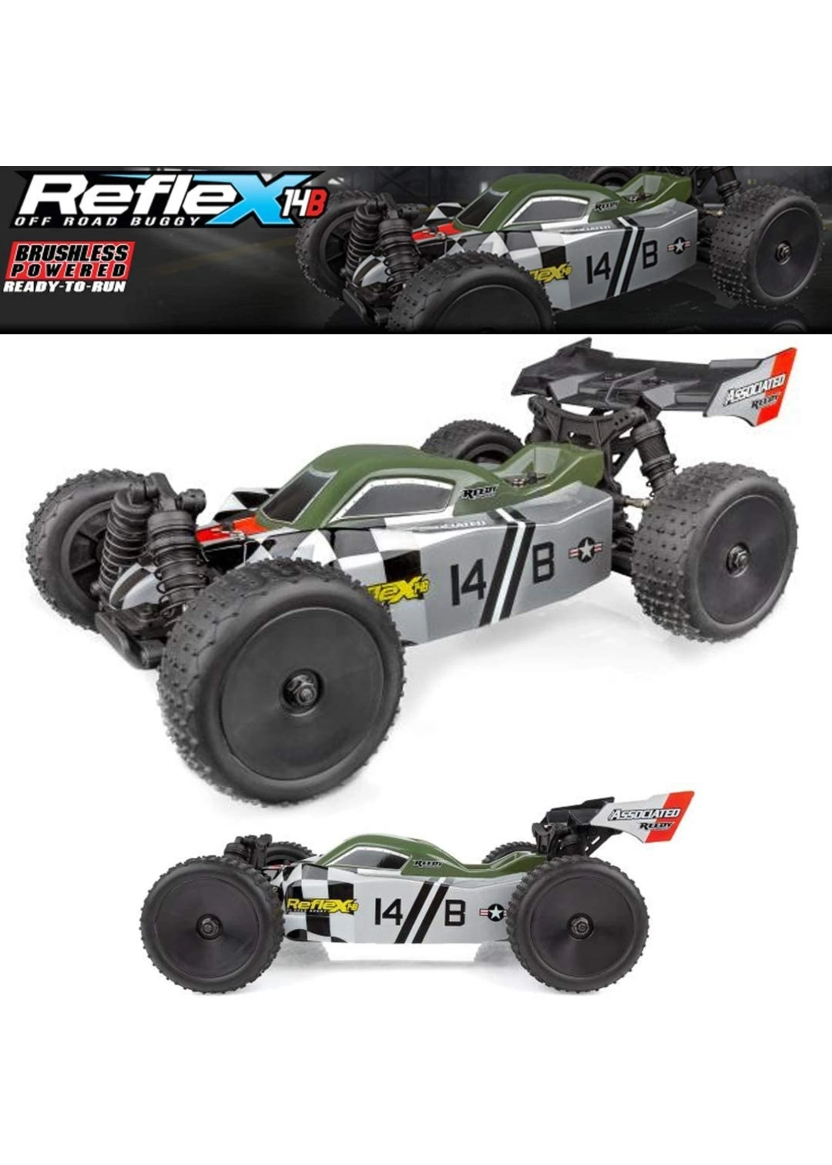 Team Associated 1/14 scale reflex 14B 4WD electric Buggy comes out of the box already assembled, with a Reedy power brushless speed control and motor, high-torque digital steering Servo, and 2.4GHz radio system. With all that power at your disposal, the buggy’s design effortlessly channels It into 4WD fun! The adjustability offered by the turnbuckles, caster blocks, and rear hubs make the reflex 14B ready for any terrain you can throw at it. Additional features include three sealed differentials, aluminum steering Rack, and lightweight aluminum center driveshaft. By adding a battery pack of your choice to the reflex 14B RTR, you can now have big performance in a small-scale ready-to-run package!