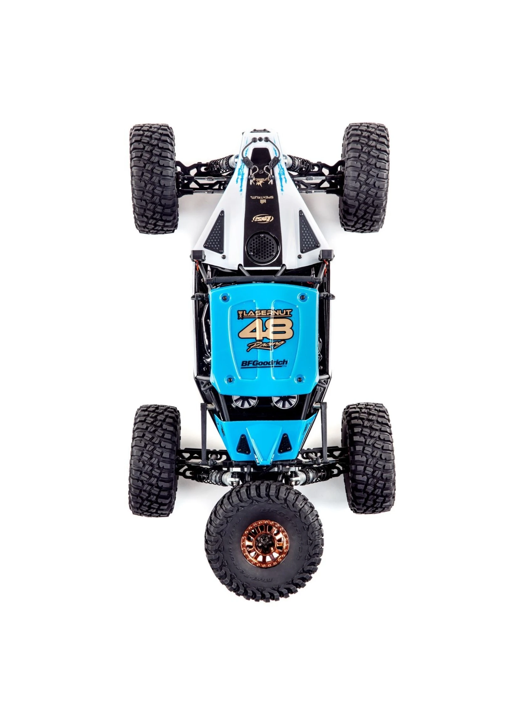 The TEN 4WD platform is recognized all over the world as the personification of strength and durability. The Losi® Lasernut U4 1/10-scale 4WD Rock Racer (RR) RTR with Spektrum™ Smart builds on the TEN design and adds items rock racers demand such as aluminum shocks, sway bars and adjustable turnbuckles. Plus, it includes a full metric hardware package for worldwide compatibility. The Lasernut is currently the only complete Unlimited U4 FIS (Full Independent Suspension) racer on the market featuring all the technological advances drivers demand including the Spektrum Firma Smart 130A Brushless ESC and Spektrum Firma 4-Pole 1900kv 550 motor providing greater efficiency improving run times with increased power. Of course, the ESC is waterproof, completely programmable and comes pre-wired with a high-current IC5™ connector. Drivers stay in control with a DX3™ transmitter, a Spektrum AVC® receiver with steering priority, and an officially-licensed Lasernut race-inspired scale U4RC body/roll cage with two different graphics and color variations. Working together with BFGoodrich Tires, the Lasernut U4 has scaled down KM3 tires that have an aggressive tread pattern capable of handling any terrain. The Losi Lasernut Rock Racer is the ultimate U4 racer with scale looks, insane speeds and performance, and Spektrum Smart Technology.