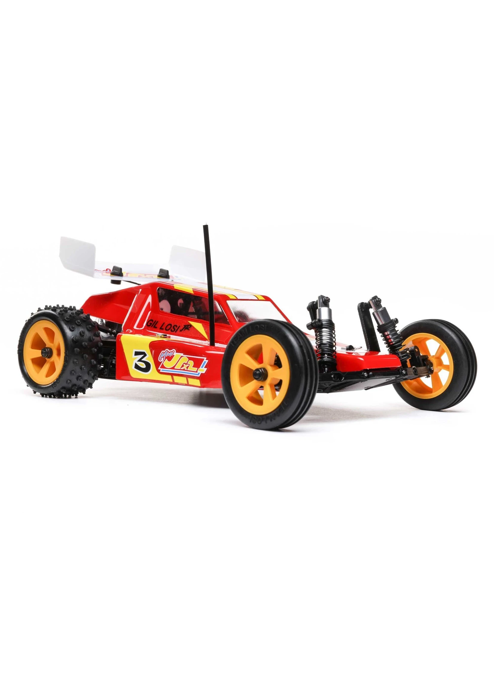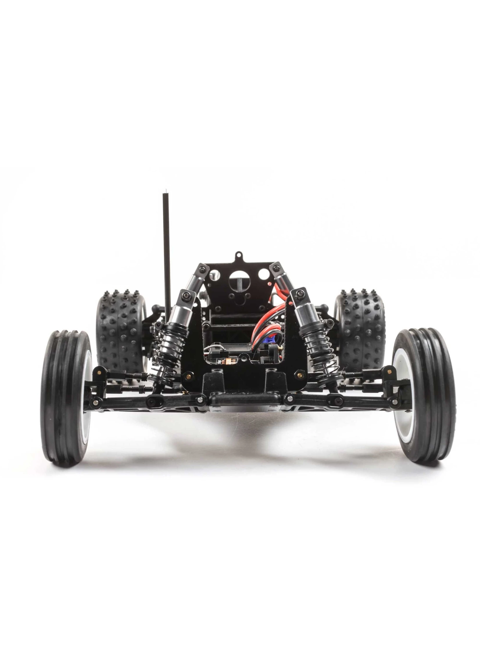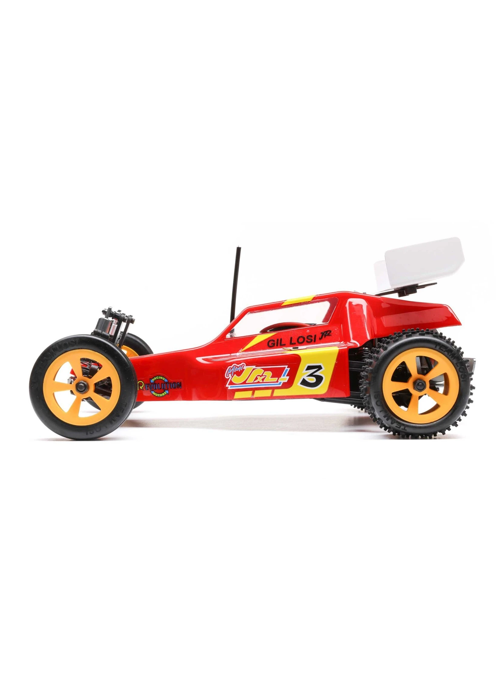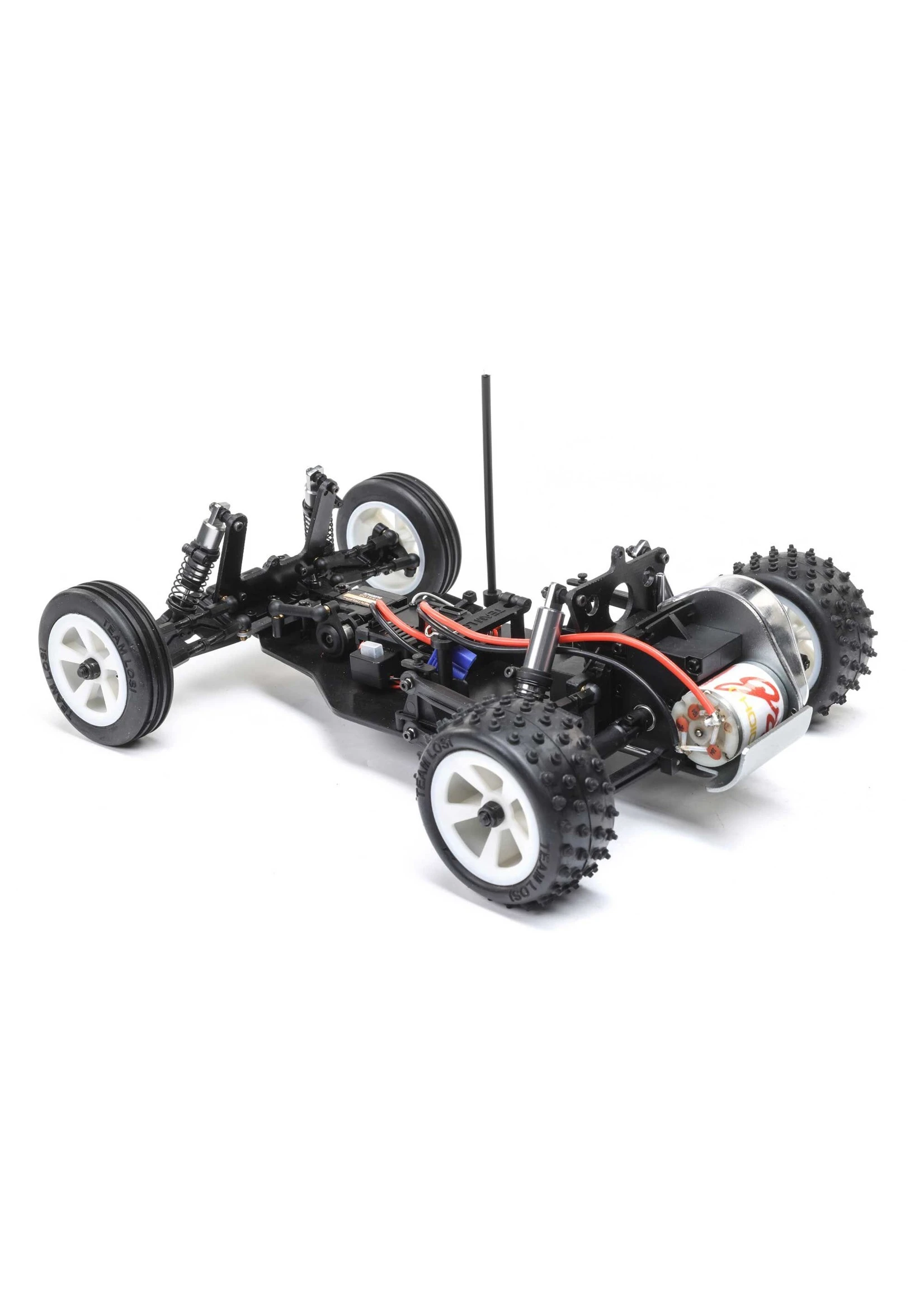 For years, racing enthusiasts demanded a re-release of the JRX2 buggy, the original vehicle that made Losi a worldwide force to be reckoned with, and now they get their wish in a 1/16th scale package. The Losi Mini JRX2 Buggy honors its roots by creating a mini buggy with a classic look and 21st-century performance. With a 5-link rear suspension providing maximum grip in loose conditions, aluminum shocks, and era-specific ribbed front tires, and 4 row step pin rear tires, you get more from a Mini than ever before. It features a rear motor configuration like the original and three different trim schemes that mimic the original box art schemes of the era, all in a total ready-to-run package. Everything about this buggy is designed to deliver a jaw-dropping experience.