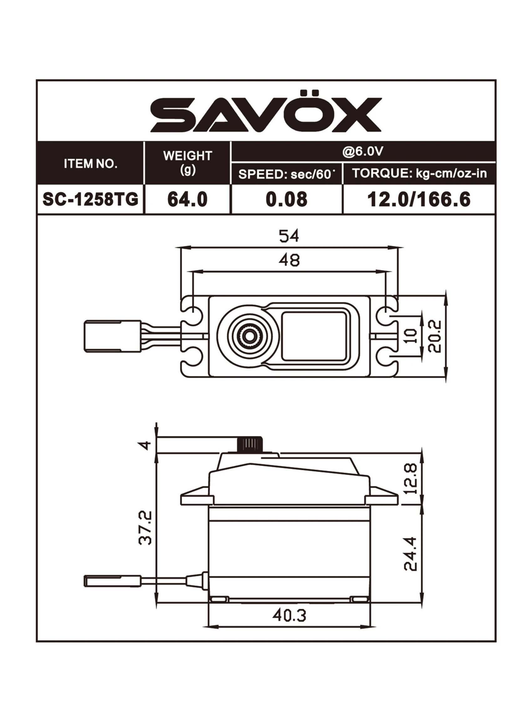 - Torque @ 4.8v – 9.6kg/133.3oz-in