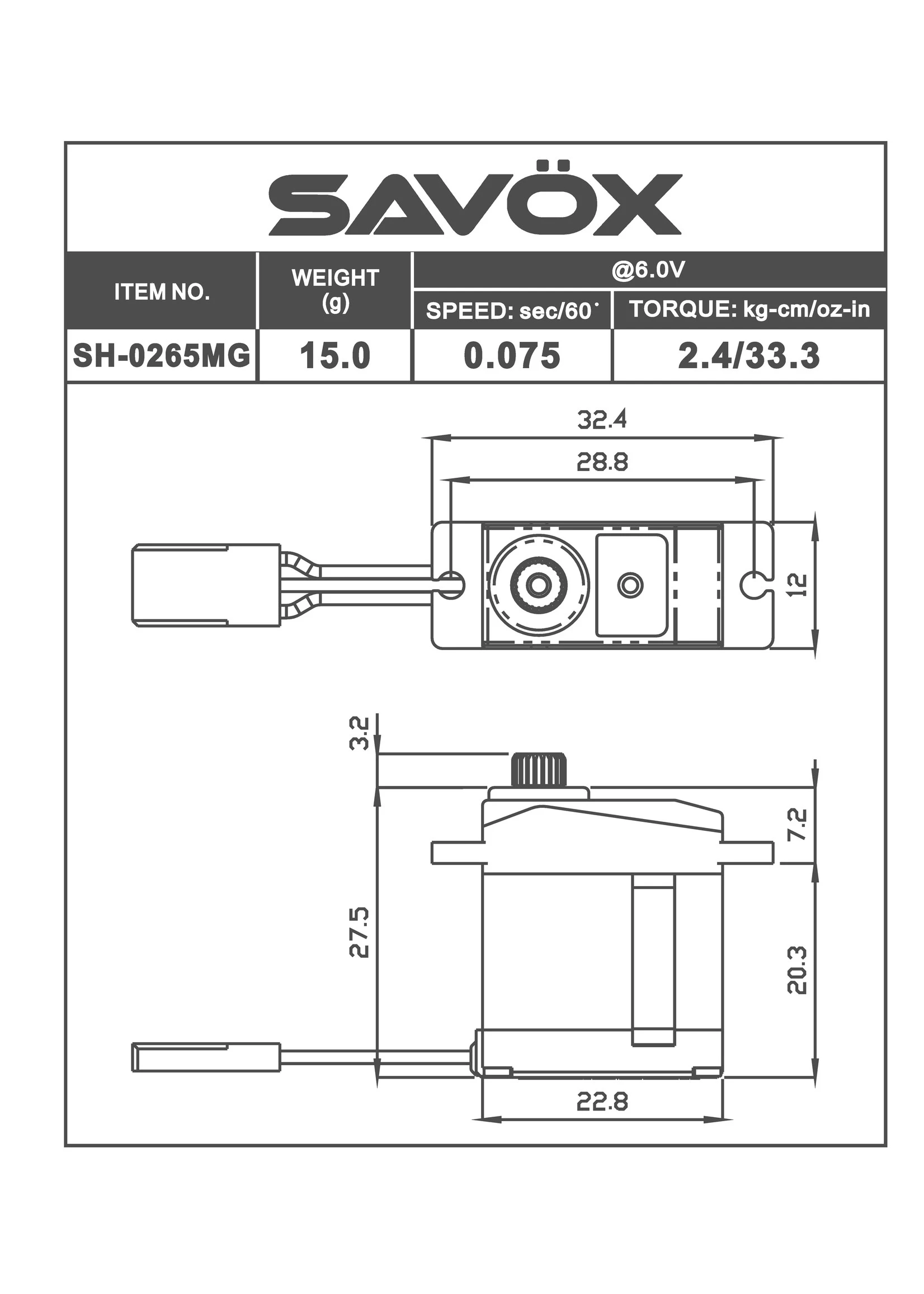- Torque @ 4.8v – 1.8kg/25.0oz-in