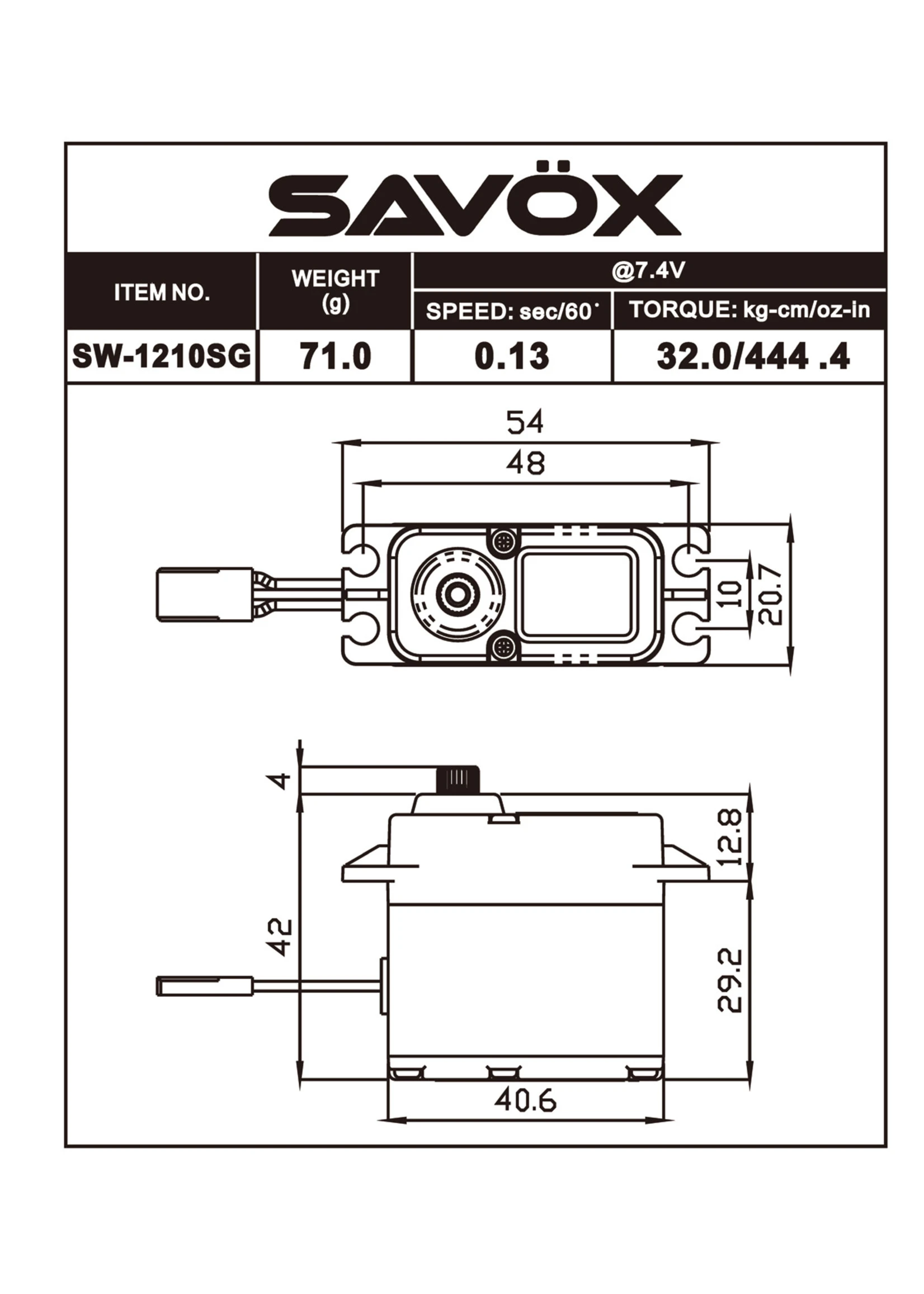 - Torque @ 7.4v – 32.0kg/444.4oz-in