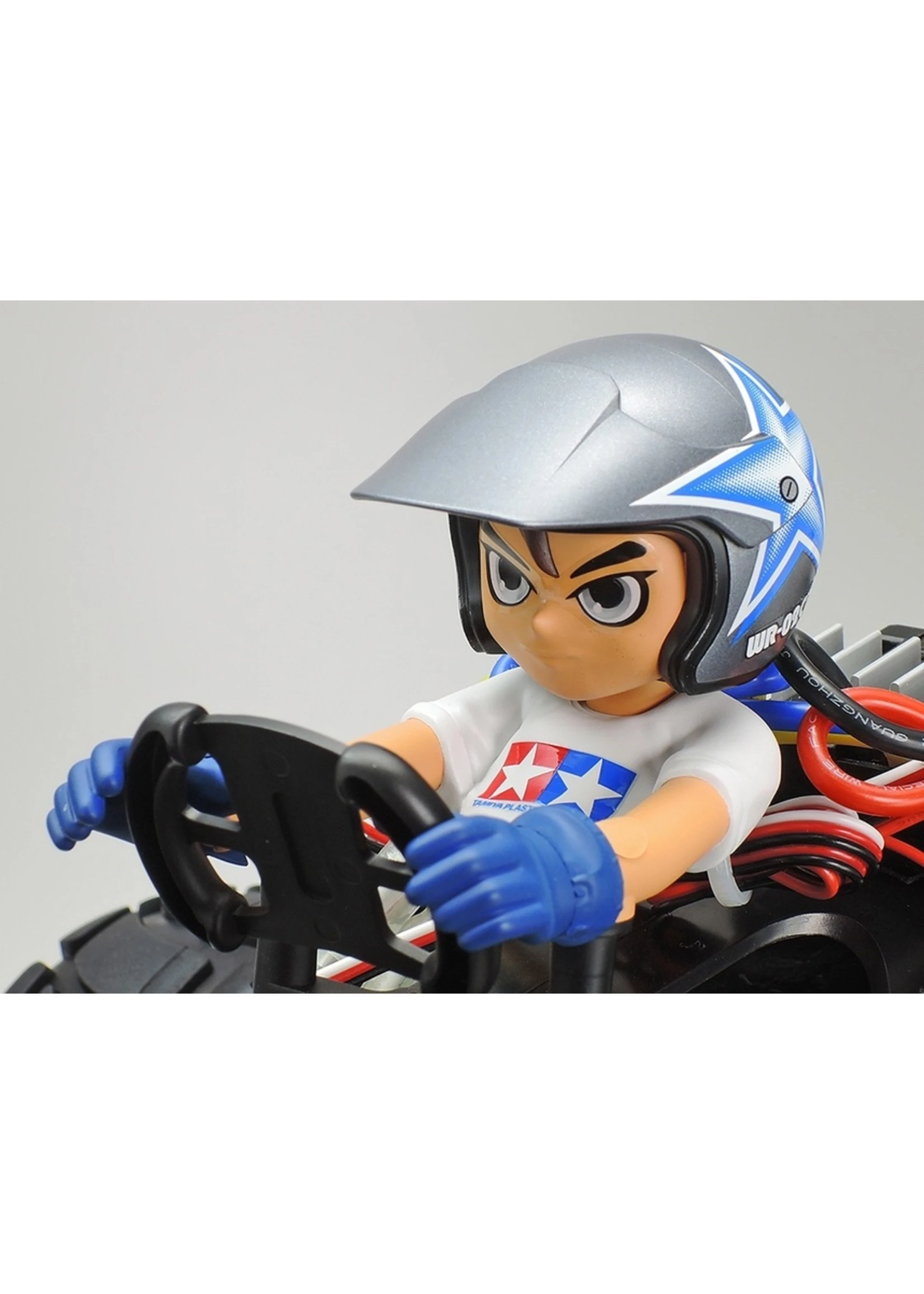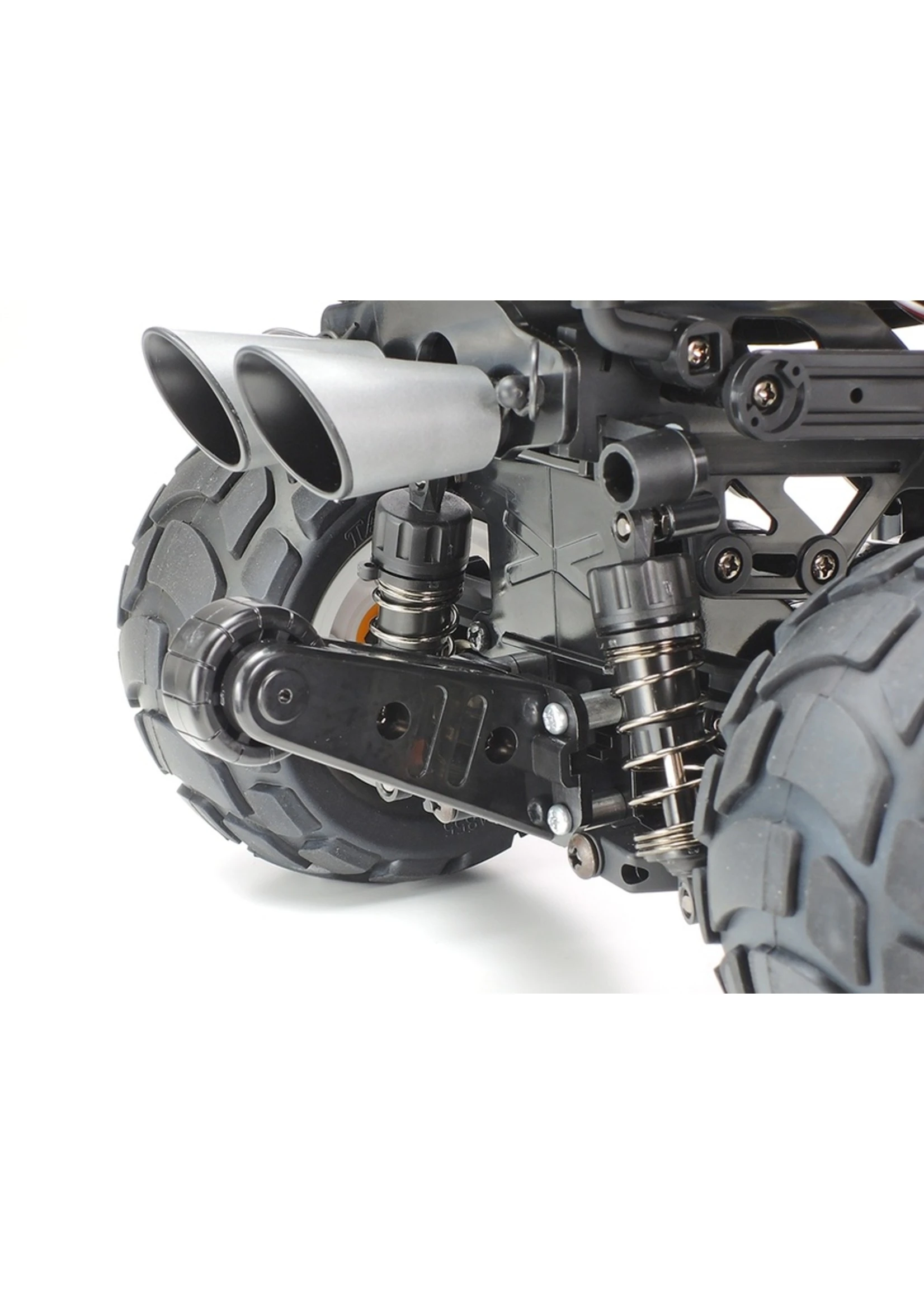 The WR-02CB chassis is an exciting chassis at home on- and off-road, providing smooth driving and the potential for exciting wheelies! It features a pre-assembled gearbox with motor already attached to save hassle in the assembly process. Long suspension arms and CVA oil dampers make for excellent off-road performance, while underguard and side guards give great protection. A rear wheelie bar helps support the model when it leans back, maintaining a fun wheels-in-the air stance as the model plunges forward. Green and white 2-piece wheels are joined by bubble tires (front: ribbed, rear: round block) for a fun look and drive.