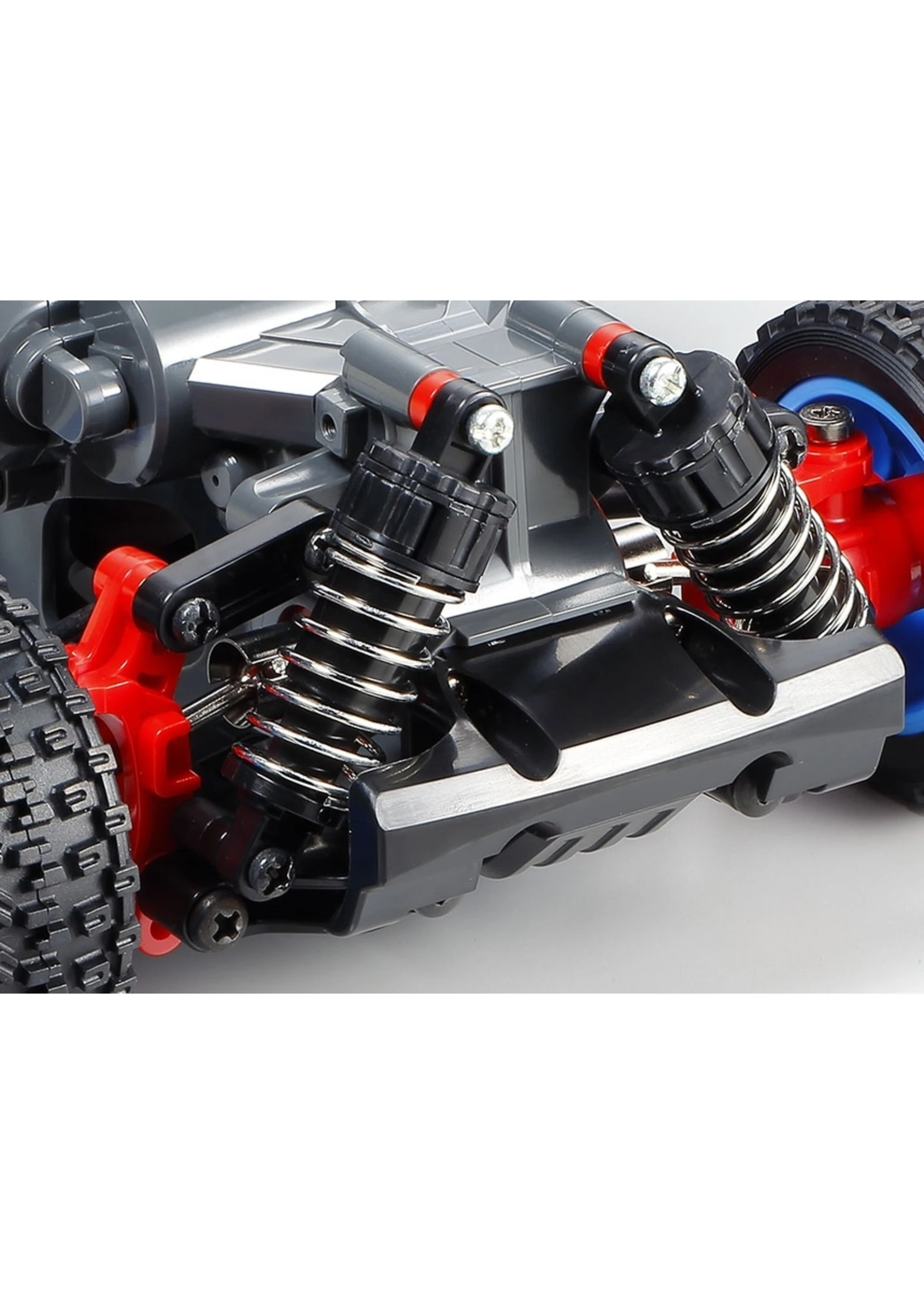Based around a tough monocoque frame with integrated gearboxes, this compact 4WD chassis gives a thrilling drive whether you take it on road or flat dirt surfaces. It features a rear-mounted motor, with gear-driven rear wheels and a propeller shaft taking power to the front. Both front and rear gearboxes have differential gears. The battery pack location in the chassis center secures excellent balance, while 4-wheel independent double wishbone suspension employs friction dampers. Rally Block tires with width/diameter of 27/69mm are also included.
