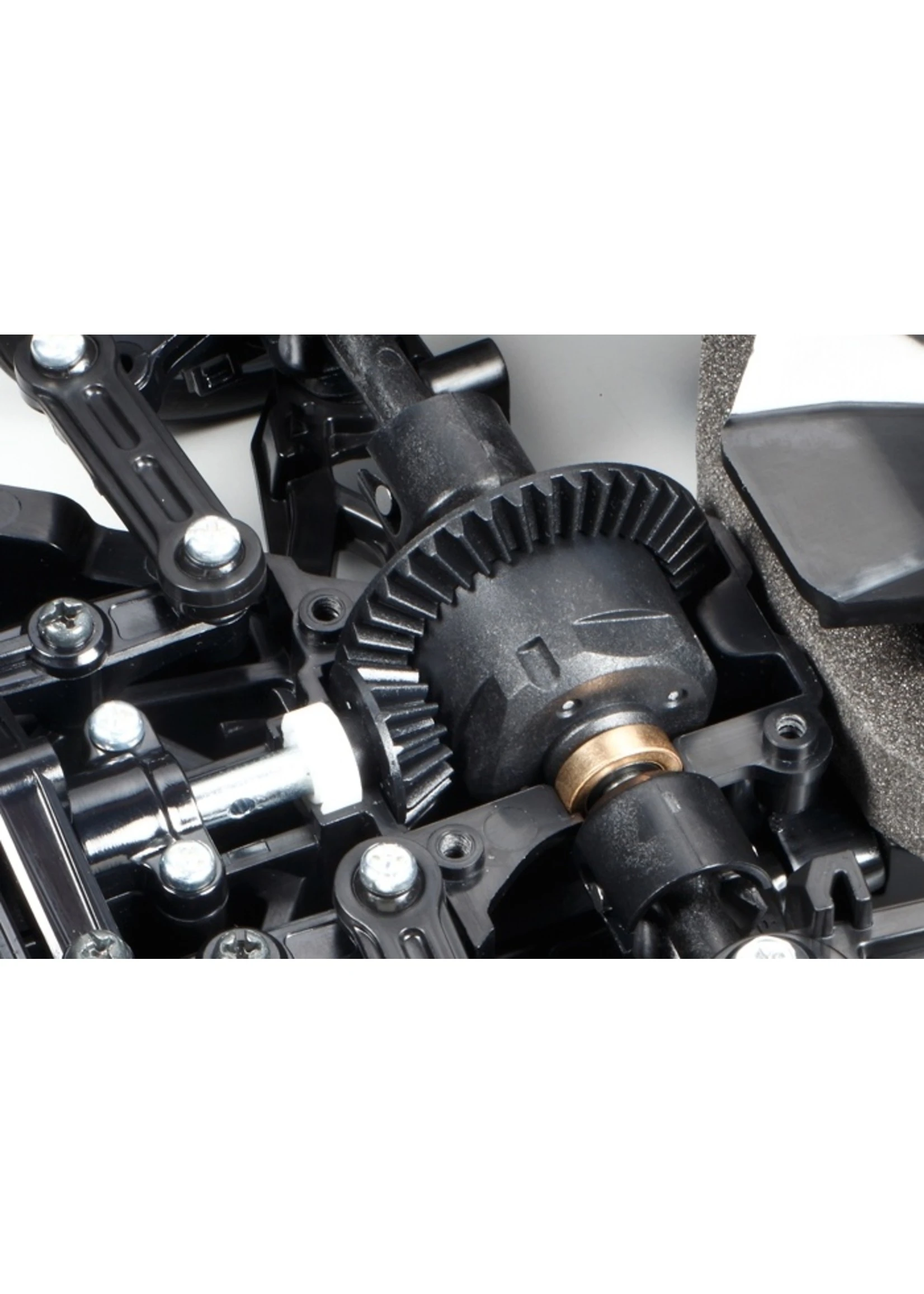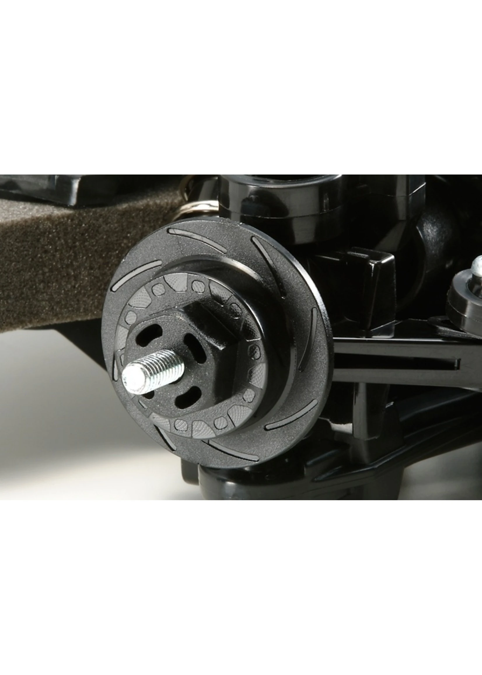 The shaft-driven 4WD TT-02 chassis employs a longitudinal layout with the battery on the left and the motor on the right, to give excellent stability. In addition, it features identical left and right suspension arms and uprights for ease of assembly, plus easy-to-maintain gearboxes. It is a highly adaptable chassis, as it offers 2 different wheelbases, 2 ground clearance settings and 2 tread set-ups in addition to a range of 10 possible gear ratios. It is not short on looks either, with brake disc-shaped wheel hubs and stylish front bumper supports. Black 12-spoke wheels are paired with slick tires for a racy finish.