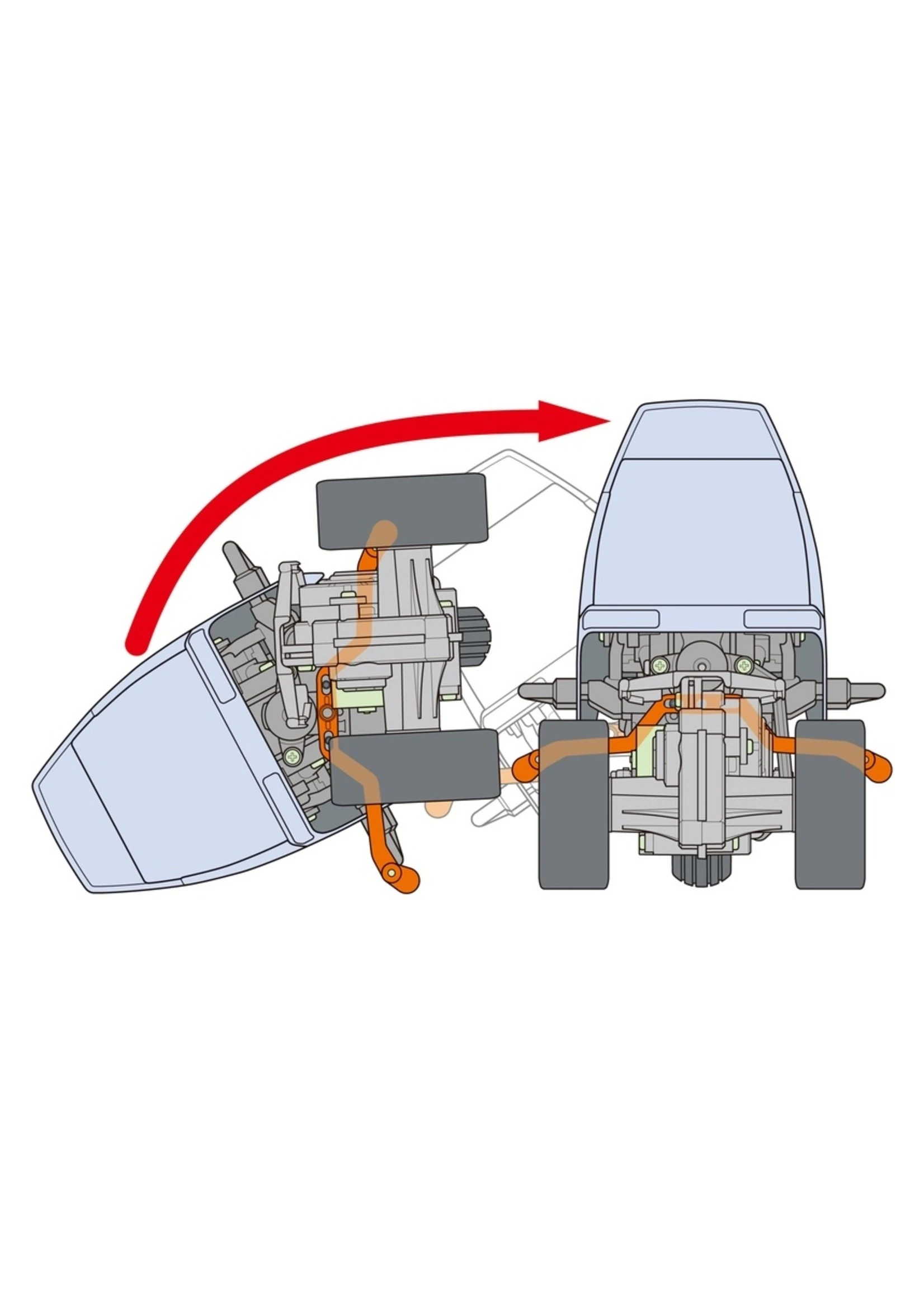 This radio control model replicates delivery trikes widely seen making deliveries in Japan. When the model turns, the 3-wheel chassis “leans” into the corner much like their full-size counterparts. The 3-wheel chassis features the motor in the rear section, with the battery in the front. The two sections are linked in the middle, and a steering servo leans the entire front section left and right to effect turns. Furthermore, support arms are linked to the steering servo, and help to right the model if it happens to tip over.