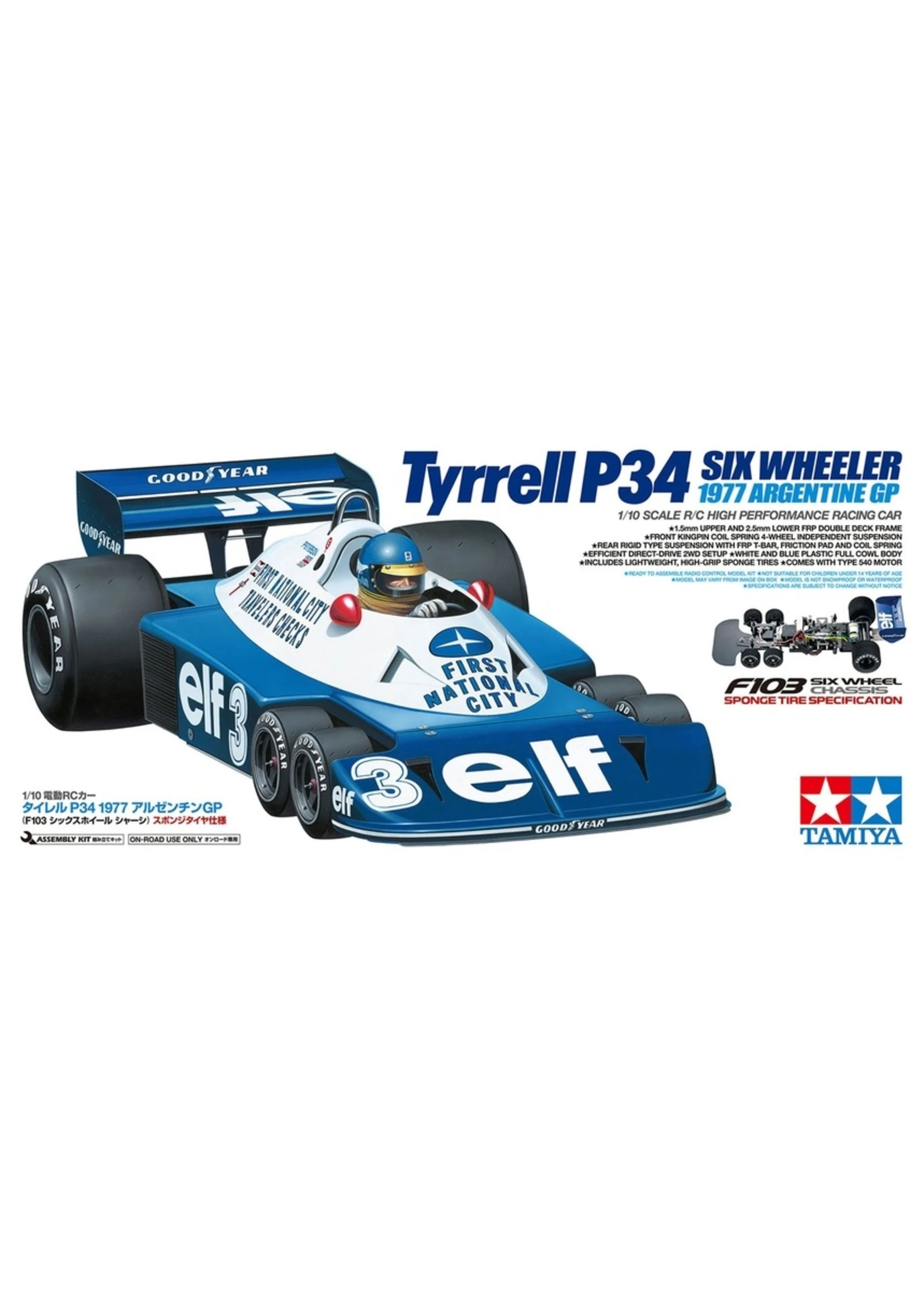 - The body is injection molded in white and blue to realistically depict the Tyrrell P34 1977 Argentine GP version.