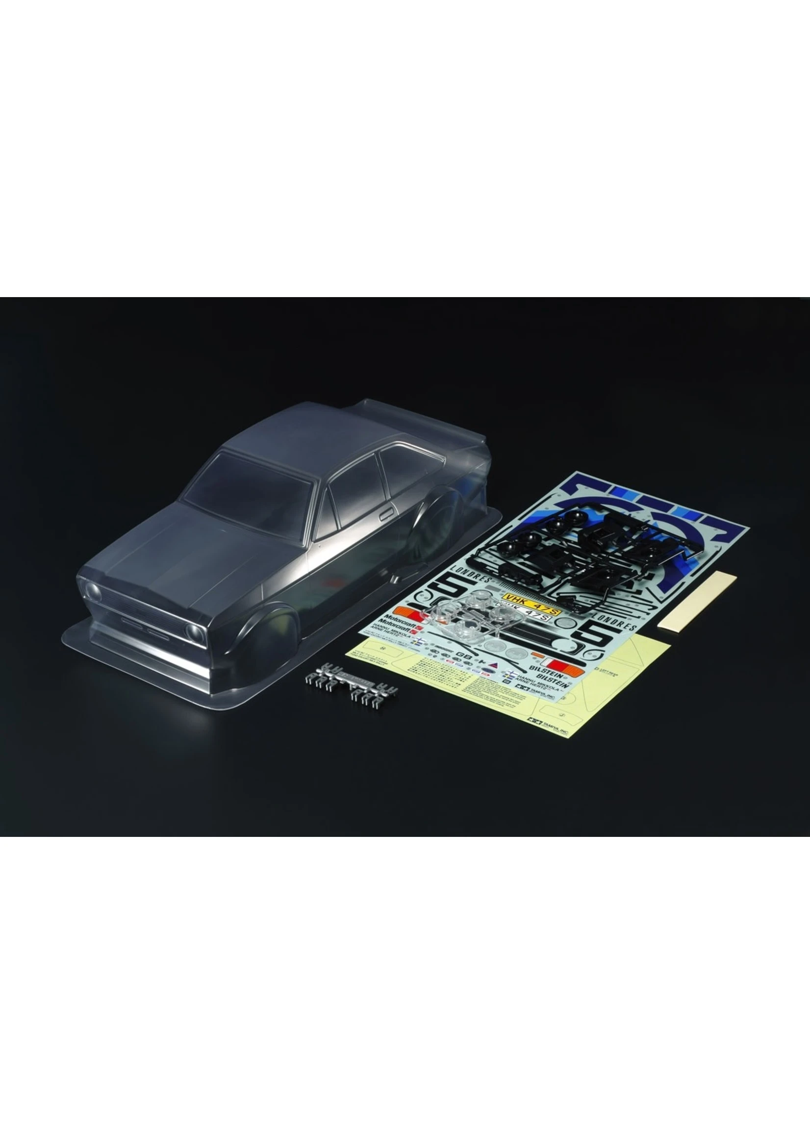 This is a complete spare part body set of the FORD Escort Mk.II Rally. It may be fitted on many of Tamiya’s M-Chassis platforms.