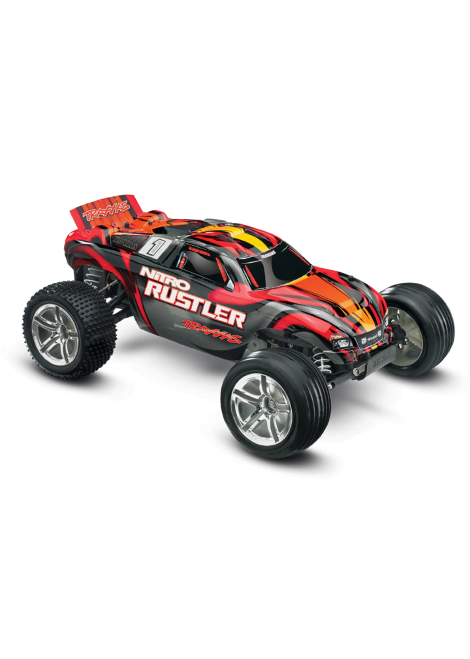 The Nitro Rustler is the first name in high performance 2WD nitro stadium trucks. Powered by the proven performance of the TRX 2.5 Racing Engine, Nitro Rustler totally out-muscles the competition with top speeds beyond 50 mph! The TRX 2.5 also pumps out the torque for brutal, wheel-standing launches and absolutely ruthless acceleration. The sleek body design cheats the wind with its smooth curves and low-slung stance, while the outrageous graphics dominate with style. The separate wing securely bolts to the body with precise aluminum hex hardware. Chrome 2.8 Twin Spoke™ rims are wrapped with pre-glued Alias™ step-pin tires in the rear and Alias™ ribbed tires up front. The high-tech rubber compound ensures great grip on a variety of surfaces. Grey-molded composite parts are thoughtfully integrated to enhance the look of the chassis. Fast, light, and loaded with power, Nitro Rustler’s power-sliding, dirt roosting attitude will have you reaching for the throttle again and again.