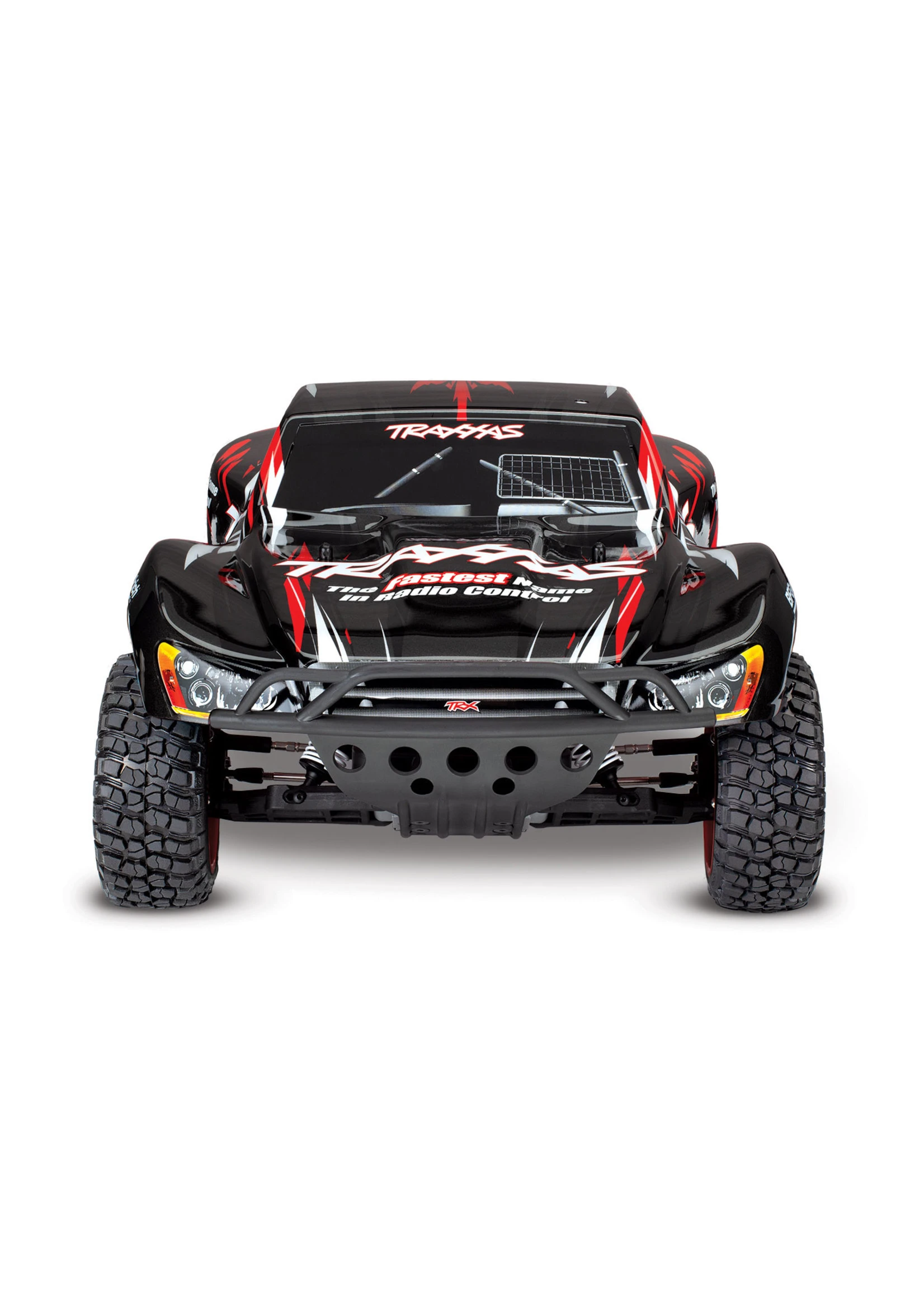 The award-winning Traxxas Slash short-course race truck puts you in the driver’s seat for intense fender-to-fender, high-flying off-road action. Full-scale short-course race trucks embody the spirit of Traxxas RC with their extreme 900+ horsepower racing engines full-throttle, dirt-roosting power slides, giant suspension travel, and big-air jumps. The Traxxas Slash brings all the action home so you can experience the high-speed head-to-head competition at the track or in your own backyard. The rear-wheel drive Slash is purpose built to fly over jumps and rip full-throttle through the turns. Slash hangs it out for an all new way to challenge your driving skills. The 4-wheel independent suspension has been carefully tuned to replicate the real world driving and handling experience as closely as possible. The scale appearing tires provide just the right amount of bite and thick, blinding clouds of dirt roost.