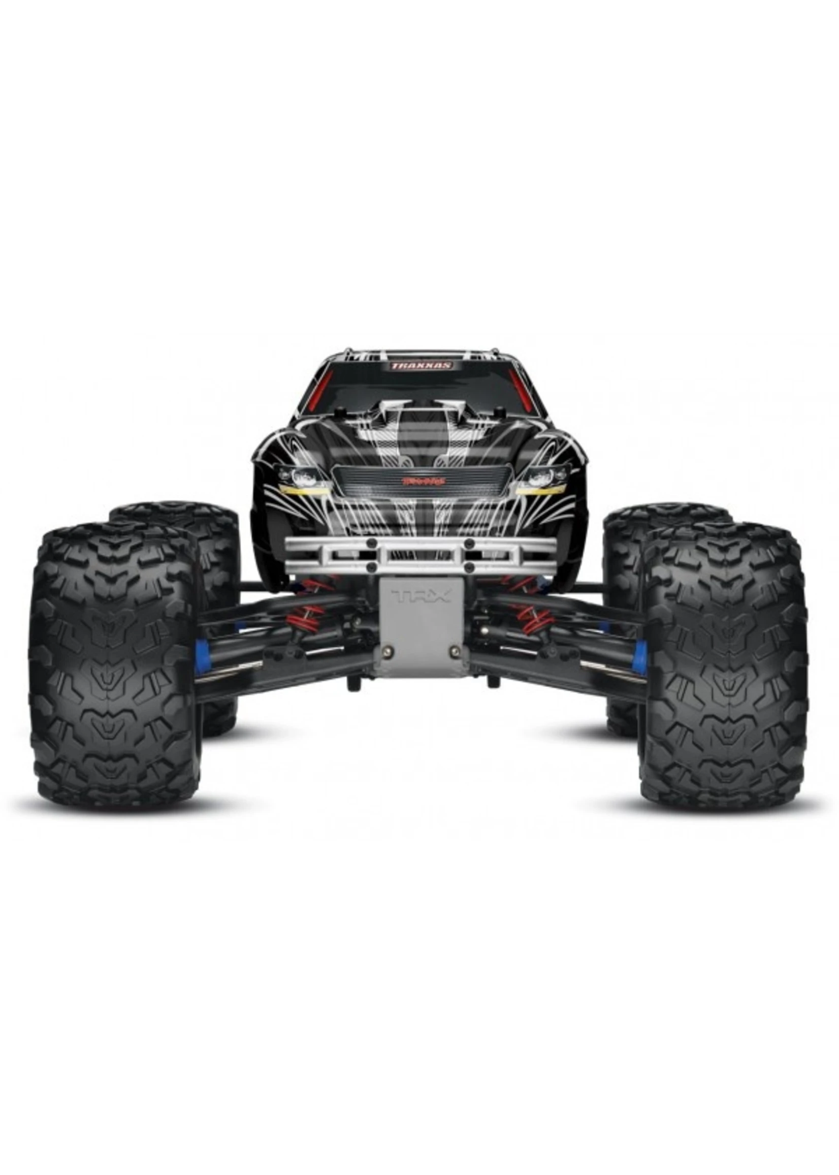 The T-Maxx 3.3 is the biggest Maxx ever. Giant Maxx tires deliver massive grip off-road and at 6.3″ tall, they add increased ground clearance to gobble up deep ruts and overcome huge boulders (be sure to check out the videos!). In the city, urban obstacles such as curbs and stairs beckon for an all-out Maxx assault. Maxx tires come pre-glued to 3.8″ Mirror-Chrome Hurricane wheels. Traxxas engineers equipped the T-Maxx 3.3 with an extended wheelbase (30mm longer) for maximum stability. T-Maxx is able to put more power the ground for even more acceleration and amazing directional control. There’s no skimping when it comes to the chassis. It’s formed from 4mm thick 6061-T6 aluminum and then anodized in brilliant blue. Meaty chassis braces and a rugged skid plate add rock-solid rigidity.