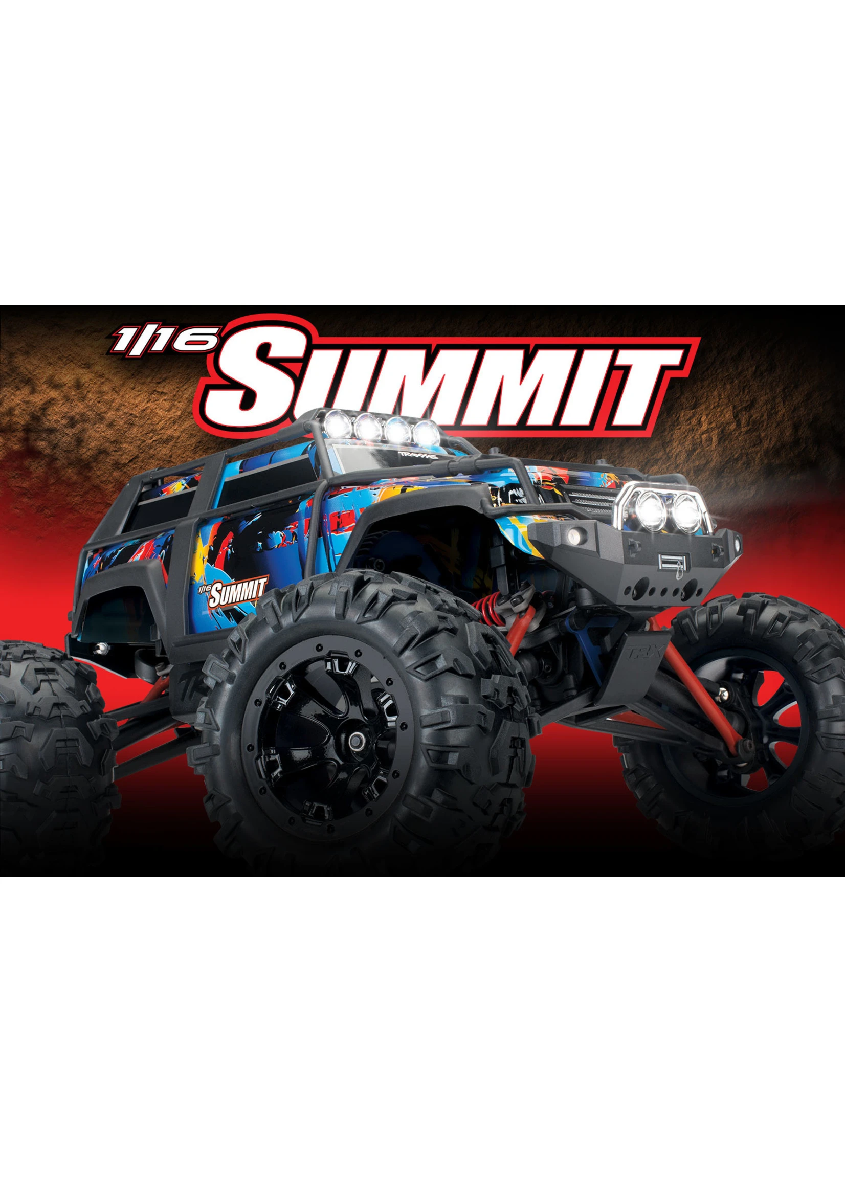 Leave it to Traxxas to stuff a 1/10 scale motor into a 1/16 scale truck! Summit’s mighty Titan® 12T 550 motor delivers nearly limitless torque for tire-scorching acceleration and all-terrain capability. With massive suspension travel, extreme Titan power, and 4-wheel drive traction, Summit tackles impossible terrain. Traxxas engineers combined all the big Summit’s go-anywhere versatility with waterproof electronics to make even your wildest adventures possible. Summit’s bright LED lights blaze a trail, making night runs more exciting than ever. The 1/16 Summit’s just-right size lets you enjoy hours of off-road fun anytime, anywhere!