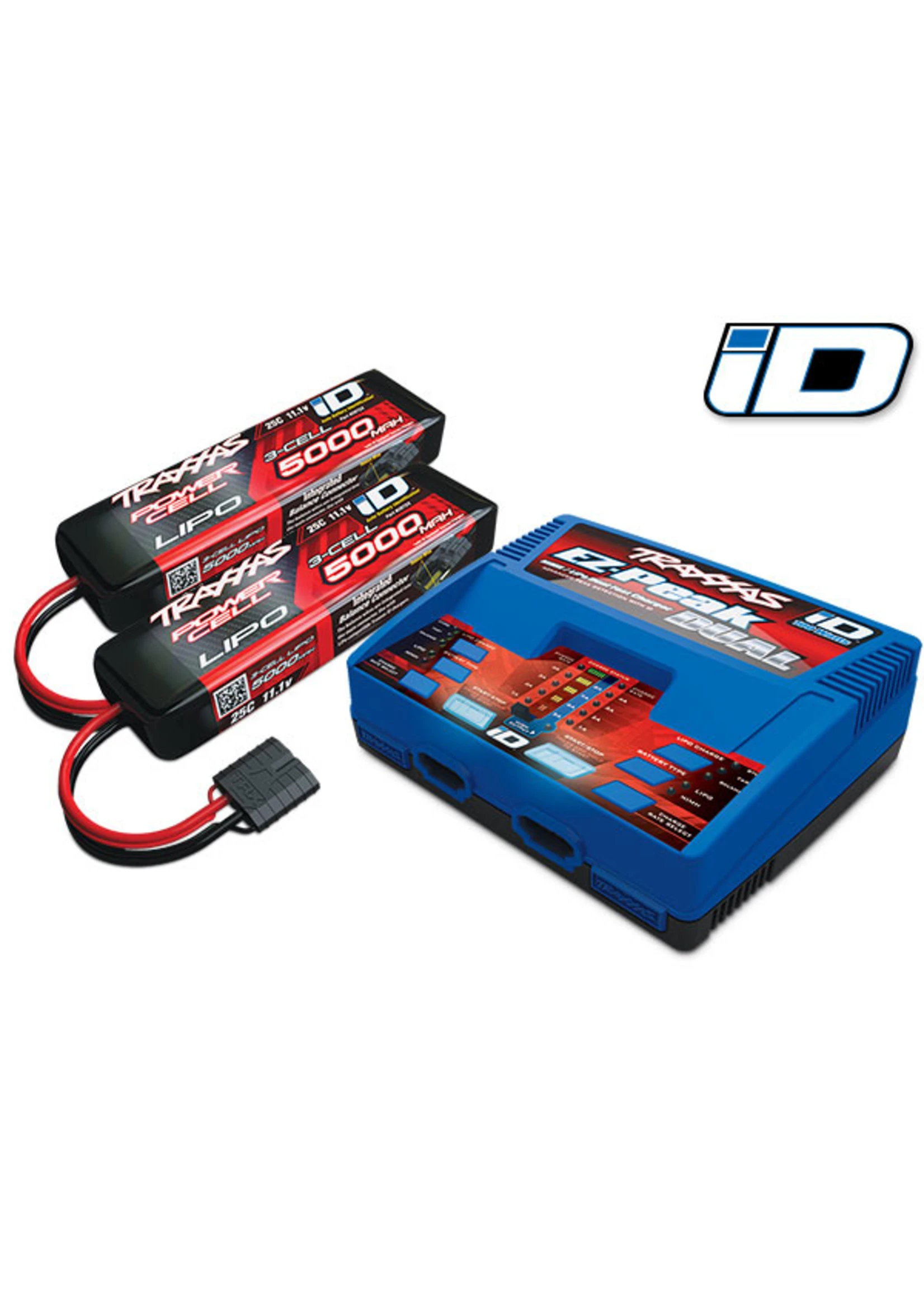 Battery/Charger completer pack includes: #2972 Dual iD® charger (1), #2872X 5000mAh 11.1V 3-cell 25C LiPo battery (2))