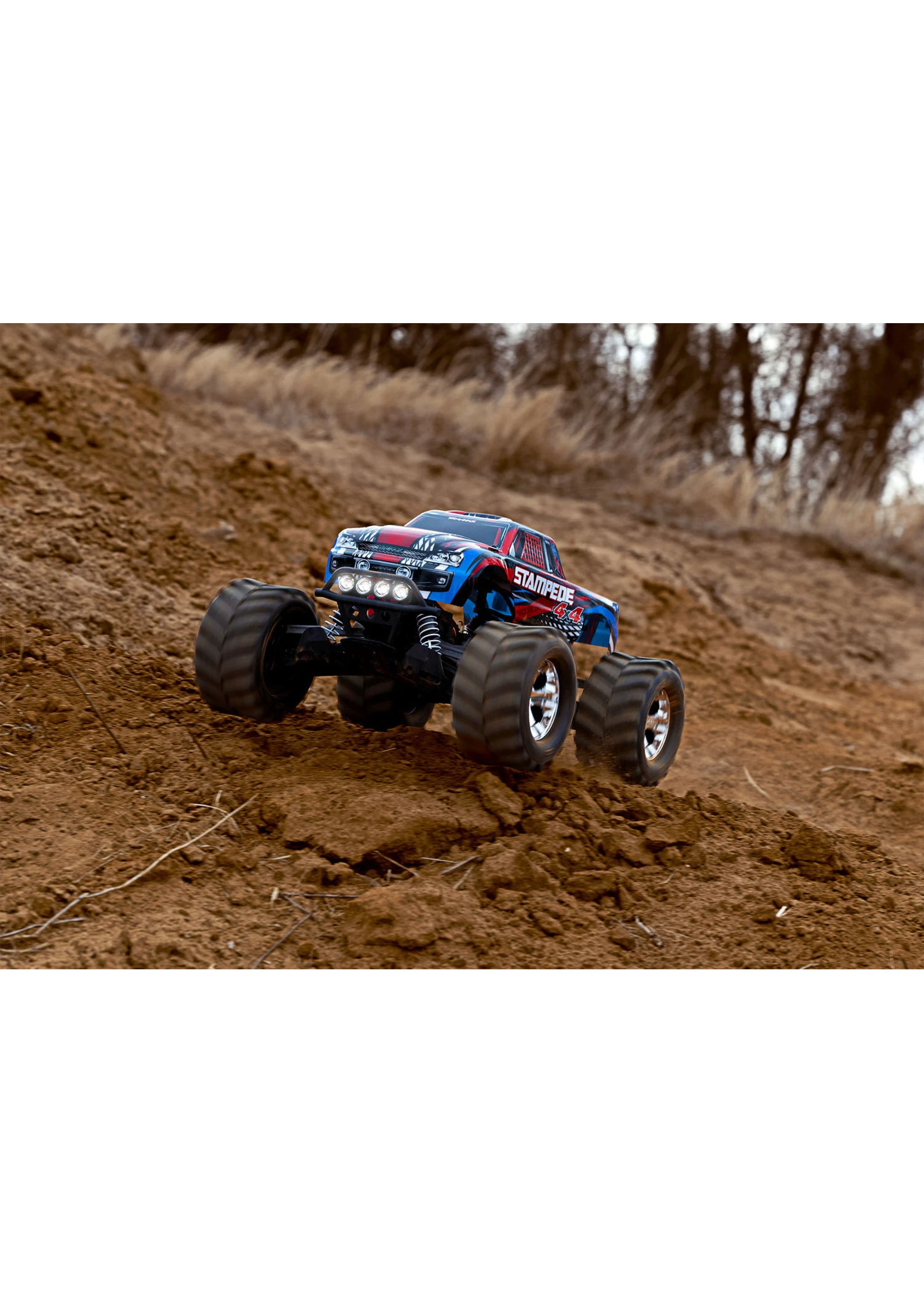 Stampede 4X4 is built Traxxas Tough™ to withstand all the 4-wheel drive monster mayhem you can dish out. Its tall ground clearance, long-arm suspension, and aggressive chevron Maxx™ tires make Stampede 4X4 feel unstoppable. Waterproof electronics keep the fun going through wet weather conditions and LED lighting extends your driving fun after dark. No other truck offers Stampede 4X4’s unique style, capability, and reputation for durability. Stampede 4X4 is perfect for any skill level and comes fully assembled, painted, and Ready-to-Drive® with the included 8.4V NiMH battery pack and charger.