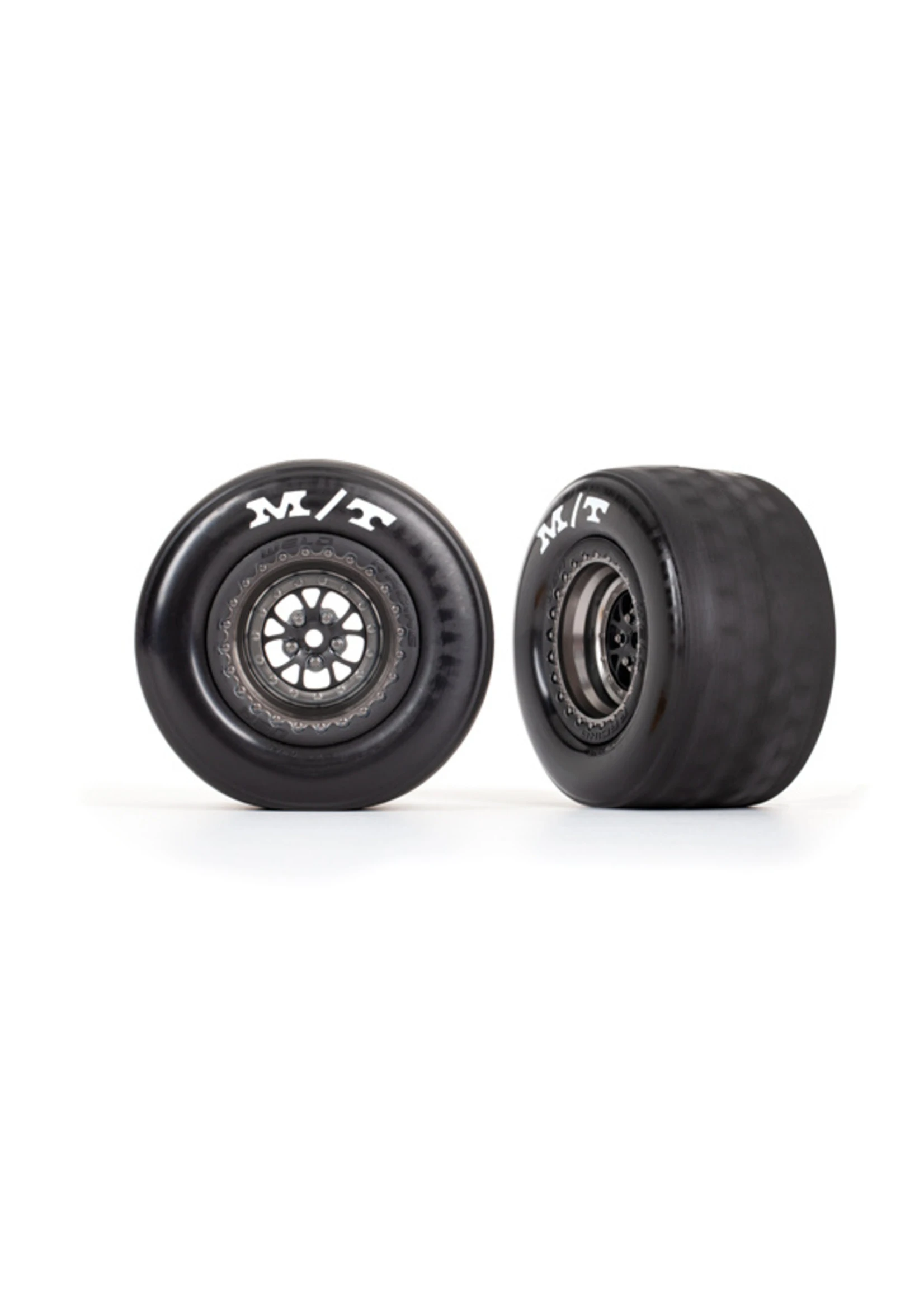 Wide Mickey Thompson drag slicks come pre-glued to satin black Weld wheels to replicate the legendary look and performance of the real thing. Developed with extensive testing, the slicks’ unique compound is formulated to balance long tire life with maximum traction.